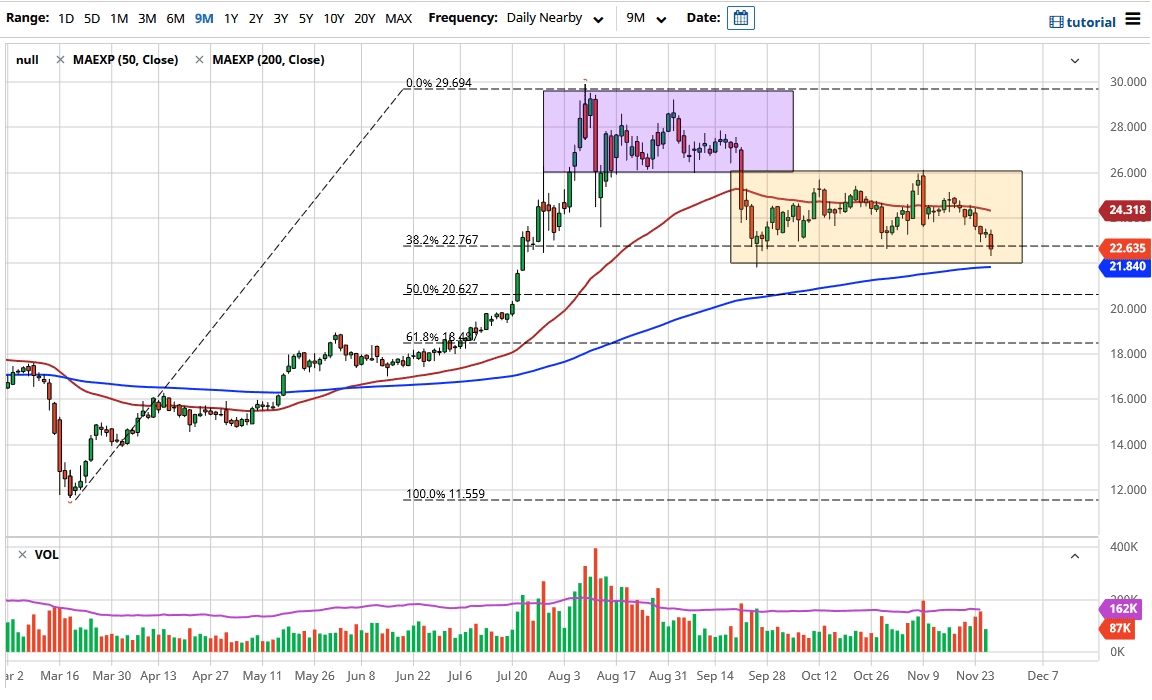 We are looking at the 38.2% Fibonacci retracement level, which we have pierced, but it looks like it is trying to hold up. We also have the 200-day EMA near the $21.84 level, so there is enough here in this general vicinity to keep the market somewhat stable. Furthermore, you can see that we had formed a hammer in the middle of September right at the same level. This is not to say that I am willing to jump in and start buying blindly; only that I am looking for a bounce to suggest that it is time to start buying. At that point, I would anticipate a move towards the 50-day EMA, which is colored in red on the chart.