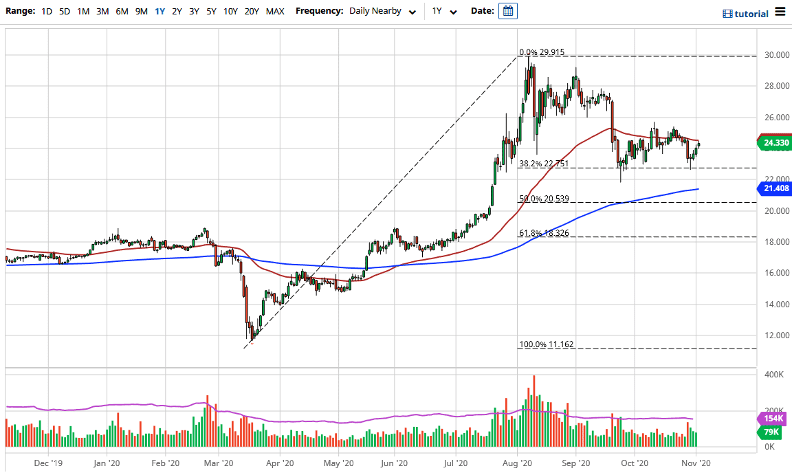If we were to break higher from here, we need to clear the $26 level to go looking towards the $27 level, which is where we have seen a lot of selling pressure in the past. Then we go looking towards the $28 level. The market is likely to continue to see volatility, and that is especially true of silver which has more volatility than other markets. A lot of back-and-forth trading is probably what we are going to see. But overall we are looking at a scenario in which there are plenty of reasons to go long from the longer-term standpoint, so eventually the fundamentals will win out. I think a simple matter of patience is what is needed. The longer-term attitude certainly should pay off if you are comfortable with taking it more along the lines of investing in less than along the lines of short-term trading.