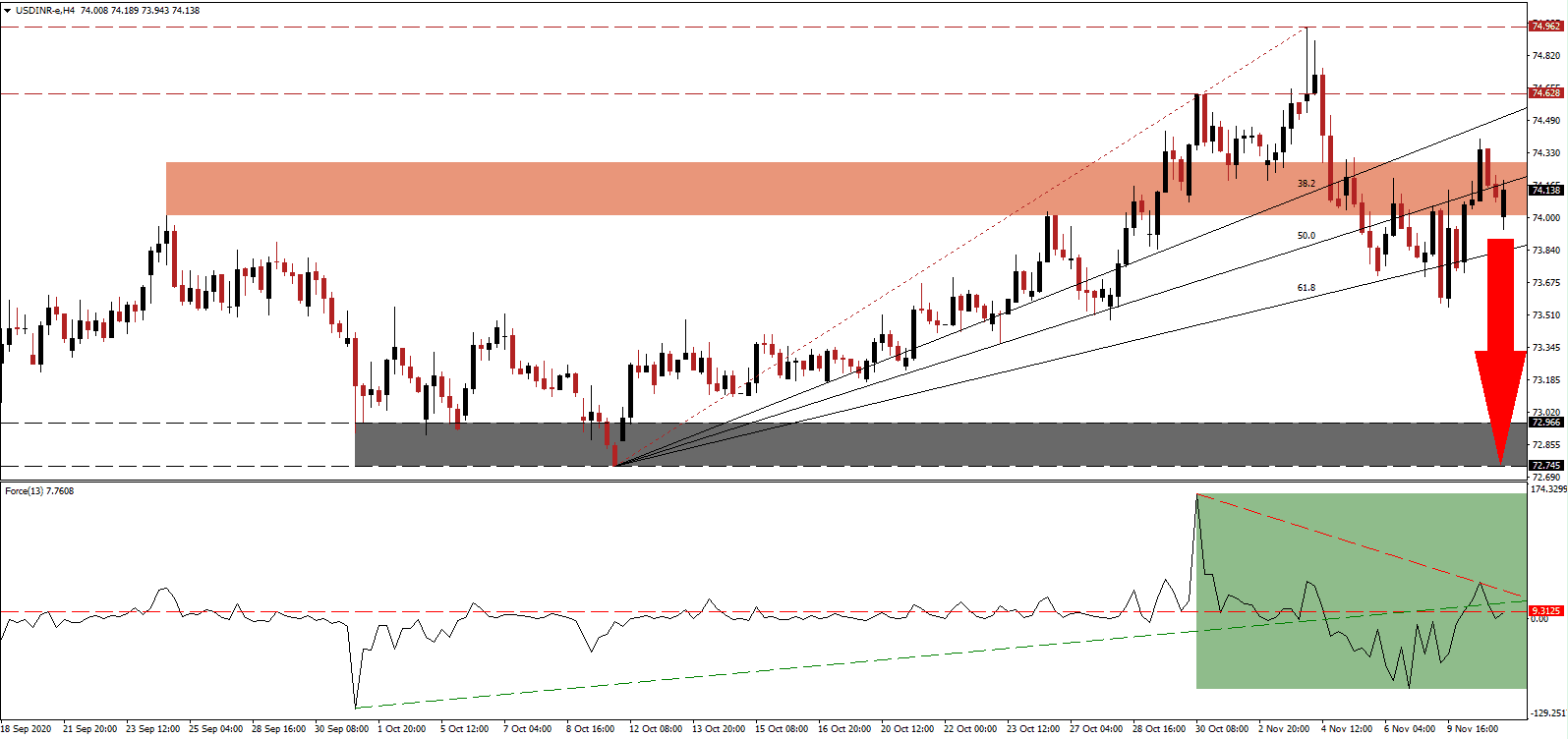 Should the Force Index eclipse its descending resistance level, the USD/INR can attempt another push higher. The upside potential remains limited to its resistance zone between 74.628 and 74.962. Forex traders should sell any advance amid a worsening outlook for the US dollar, where a Biden presidency seeks to add more debt. The second wave of the COVID-19 pandemic accelerates, and more restrictions are likely.