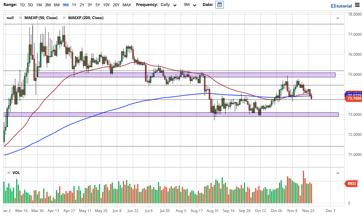 You can make out an “M pattern” forming over the last two months, so if we break down from here we will challenge the ₹73 level again. This area being broken to the downside could open up a move directly towards the ₹72 level next. There is much more of a “risk on" attitude around the world in general, so eventually we could make that move. US dollar rallies are to be sold on signs of exhaustion, which is basically what this chart has shown. However, this pair does tend to move rather slowly, so you should have plenty of opportunity to get involved in a trade if and when it shows up. I am personally looking for a breakdown below the aforementioned ₹73.68 level, or a rally that shows weakness near the ₹74 level on a short-term chart. If we suddenly get a shock to the global economic system, then this pair will go straight back up in the air.