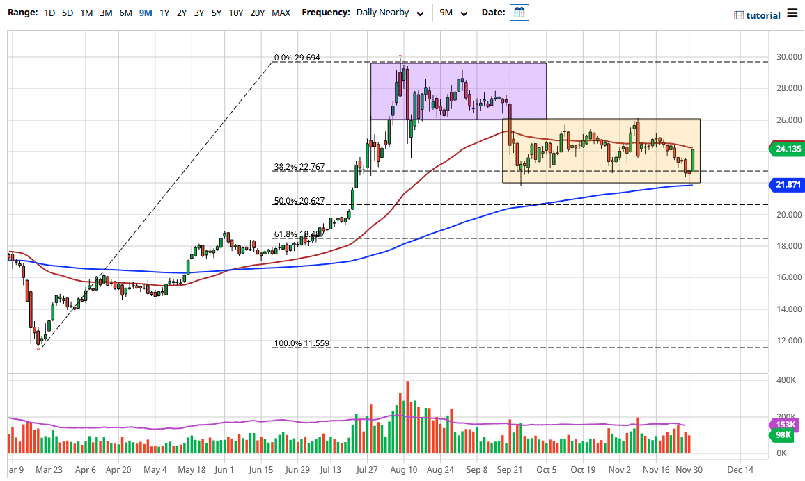 Silver has more momentum than gold does typically, and that was most certainly the case during the trading session on Tuesday. Although gold was very strong, silver gained almost 7% by the end of the day. Now that the US dollar is finally falling significantly, we could see a massive move higher. Buying dips will almost certainly be the way going forward at this point as the market has shown itself to be resilient, and it should continue to see a lot of momentum coming back into the market as we had sold off for some time. In fact, you can make a serious argument for a double bottom having just happened, so this market should continue to go much higher. I believe that the $26 level will probably be targeted initially, followed by the $30 level again. With more stimulus coming out the United States, there is a really good chance that precious metals will continue to see inflows.