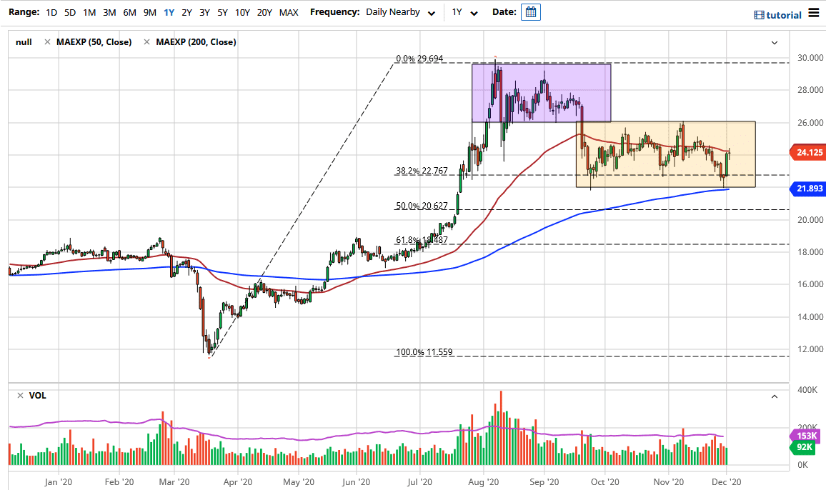 The silver markets fluctuated during the trading session on Wednesday, as we reached the psychologically and crucial 50-day EMA indicator. We are also sitting at the $24 level, so it follows that we would see the markets take a bit of a breather. Furthermore, it should be noted that after the massive gains, a lot of people will be trying to digest those massive moves. After all, it is not every day that the silver markets rally 7%.