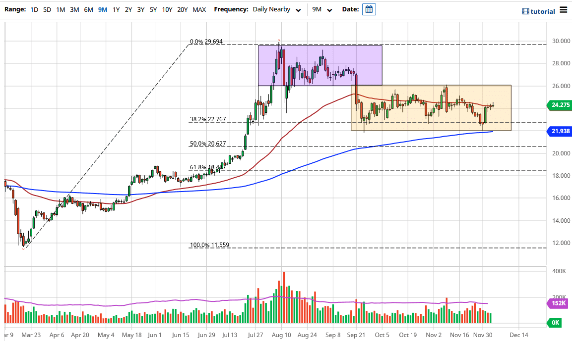 This market is choppy and noisy but there is a longer-term uptrend that is very much intact, and the fact that we have gone sideways for some time suggests that we are trying to build up the necessary momentum to go to the upside. The $30 level above was the high from the surge several months ago, and I think we will go looking there. If we can break above it, then the market could really start to take off to the upside, but I believe that is probably more or less going to be an argument for next year. In the short term, I like the idea of buying value as it appears on these dips.