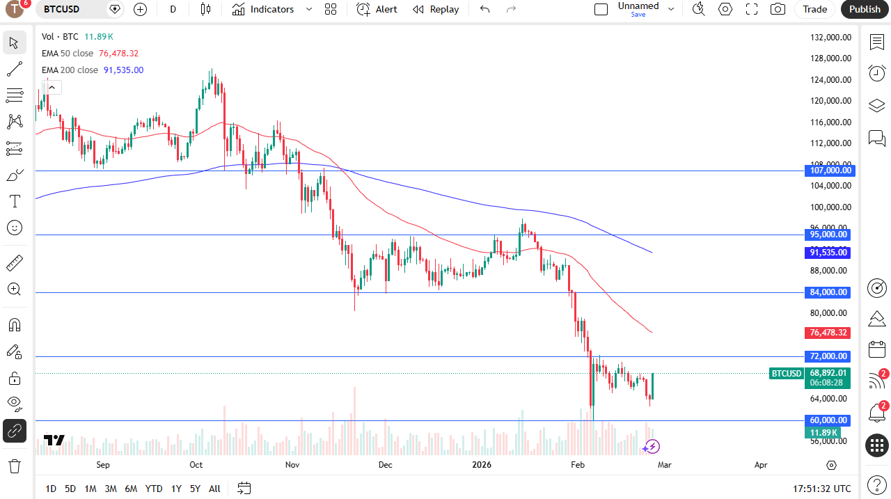 The Bitcoin market has been very strong during the trading session on Wednesday, gaining over 7% and it certainly looks as if the buyers are coming in and trying to put some type of floor in this market. That being said, we continue to see a major resistance level above at the $72,000 level. If we could break above there, then I think it brings in a little bit of FOMO, opening up the possibility of an even bigger move to perhaps to the $84,000 level.