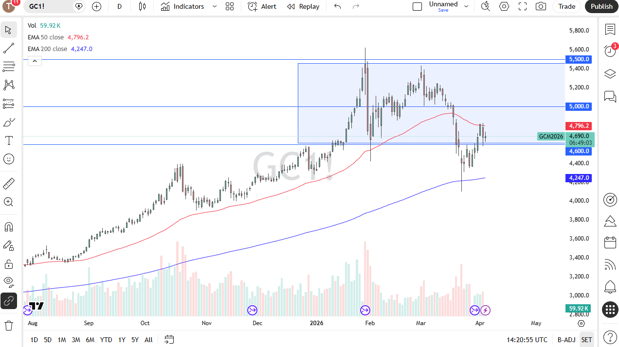 The gold market has been very choppy and noisy during the trading session on Monday as it looks like we are going to continue to see a lot of volatility. All things being equal, I'm watching the $4,600 level because quite frankly I do believe that it has a lot of market memory attached to it and I believe it is probably only a matter of time before it does in fact substantiate itself as important.