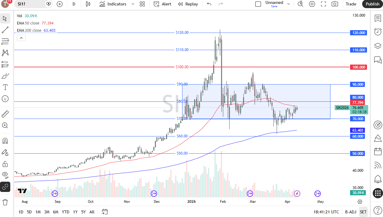 Quite frankly, if the Americans and the Iranians can come to some type of deal they both can live with, that should be good for a lot of different things, silver included. Rates should at least in theory drop from there and then silver probably breaks above the 50-day EMA, I would even venture to say gaps above there, test $80 and maybe even blows through there to go looking towards the $82 level.