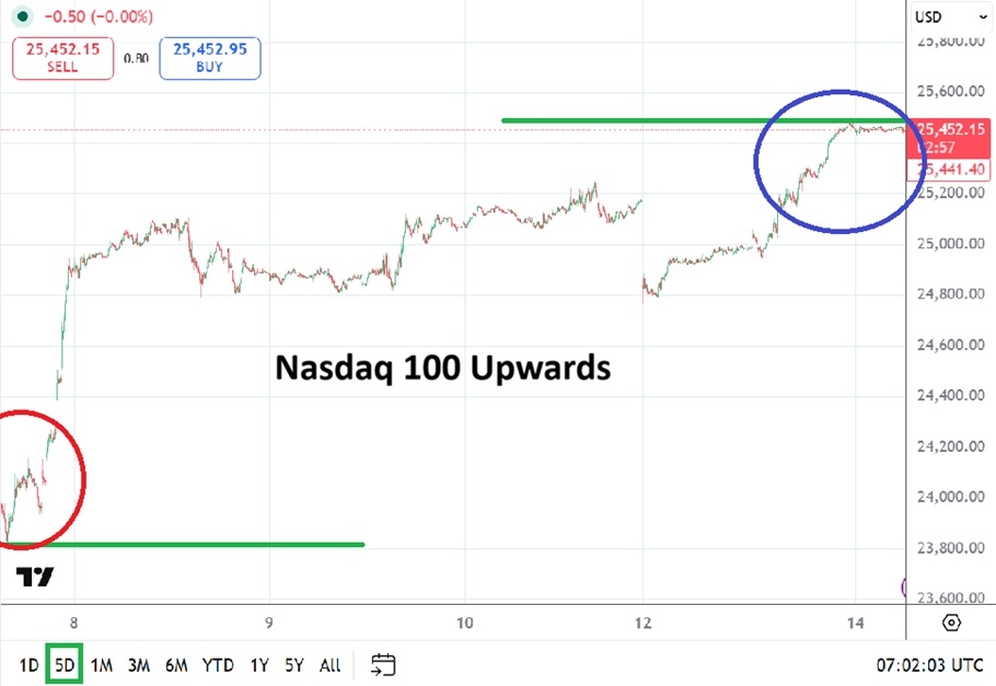 When the ceasefire was announced last week the Nasdaq 100 climbed above 25,000 on Wednesday. The ability of the Nasdaq 100 to sustain positive momentum has been embraced by financial institutions, which even after the failure of peace talks this past weekend did show buying power yesterday. And this morning’s early price action in the Nasdaq 100 continues to tick slightly higher.